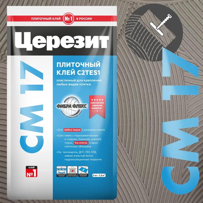 Клей СМ 17 Super Flex предназначен для крепления всех видов ми­неральных плиток — керамических, керамогранитных, клинкерных, каменных (кроме мраморных) и т.п., на стенах и полах внутри и снаружи зданий, преимущественно на сложных и деформирующихся основани­ях и элементах конструкций.